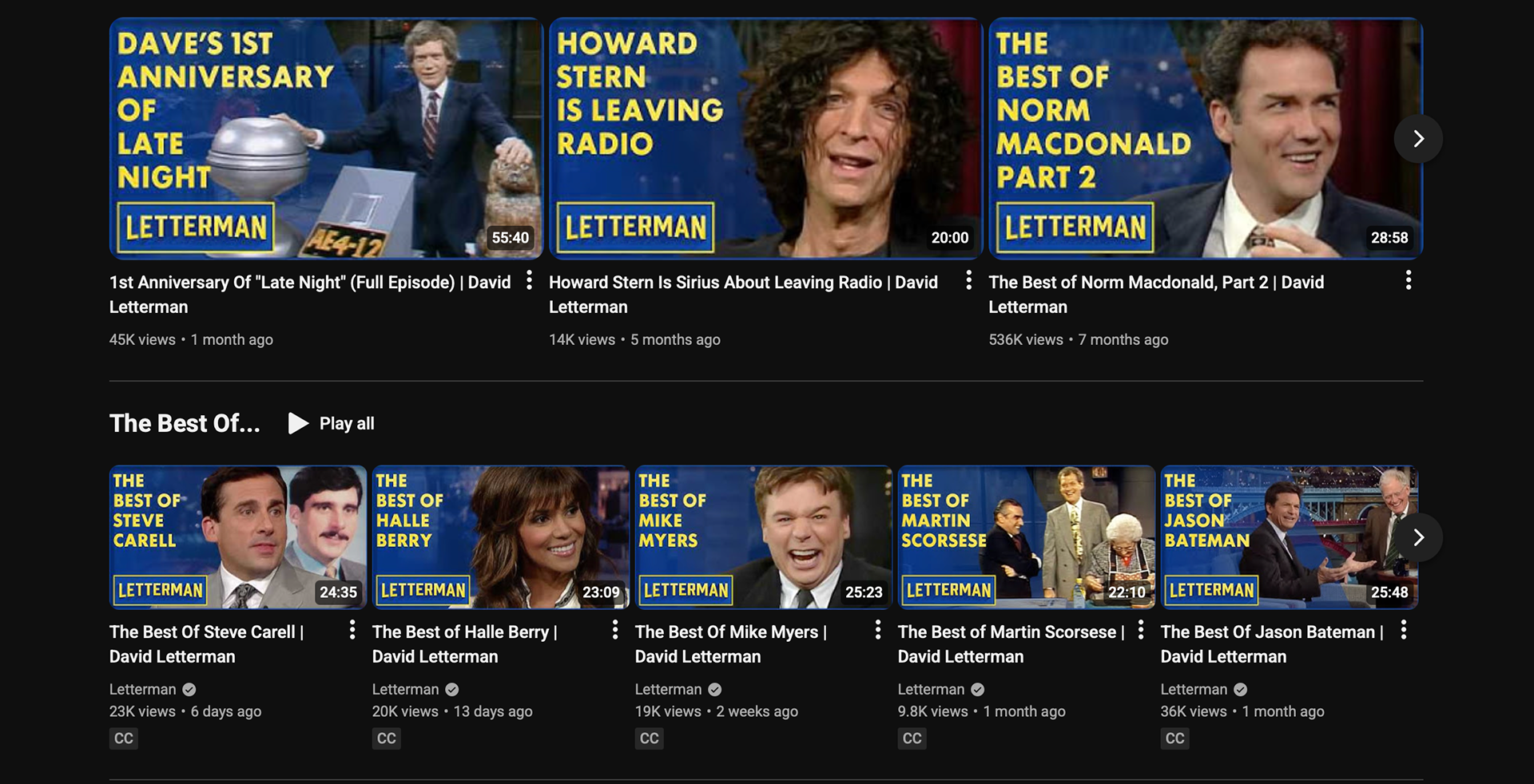 I created branding for the Letterman You Tube channel. This called for a familiar, but more modern take on the traditional "Late Show" logo. This serves as the visual cue in each video thumbnail to instantly communicate "Late Show" and Letterman.